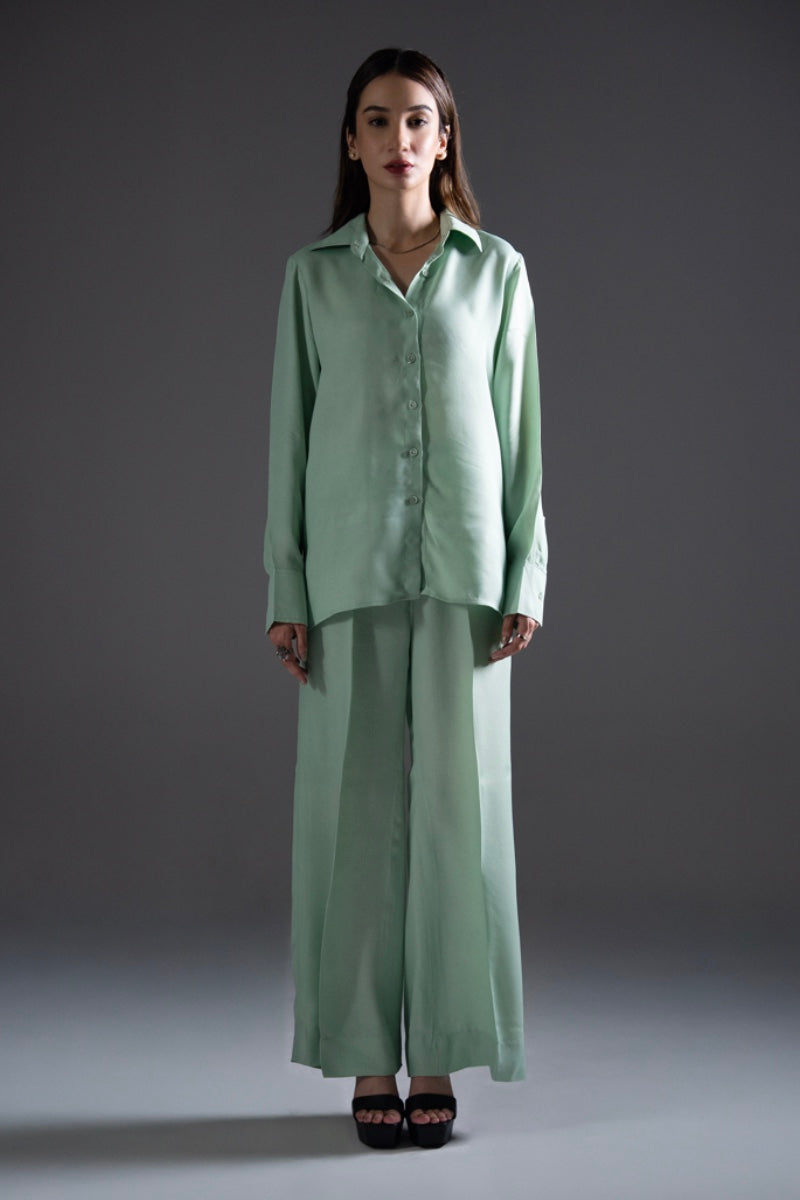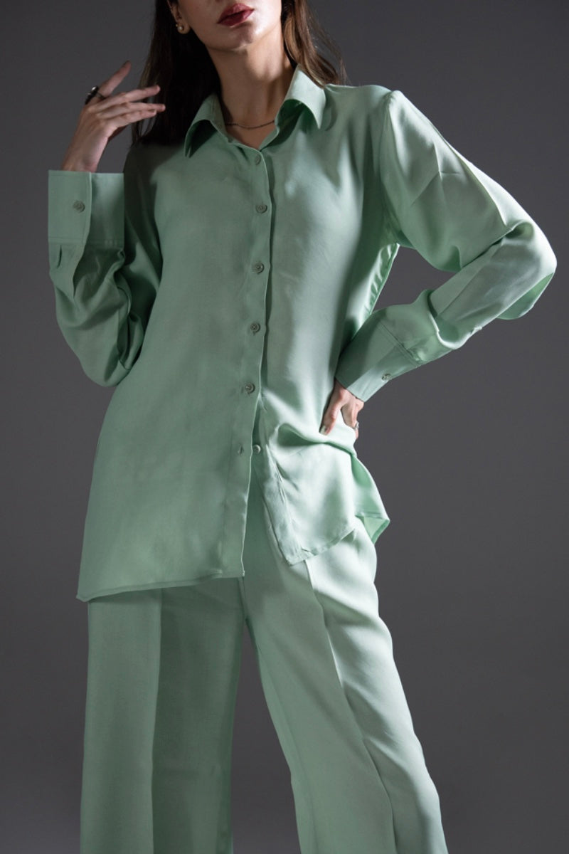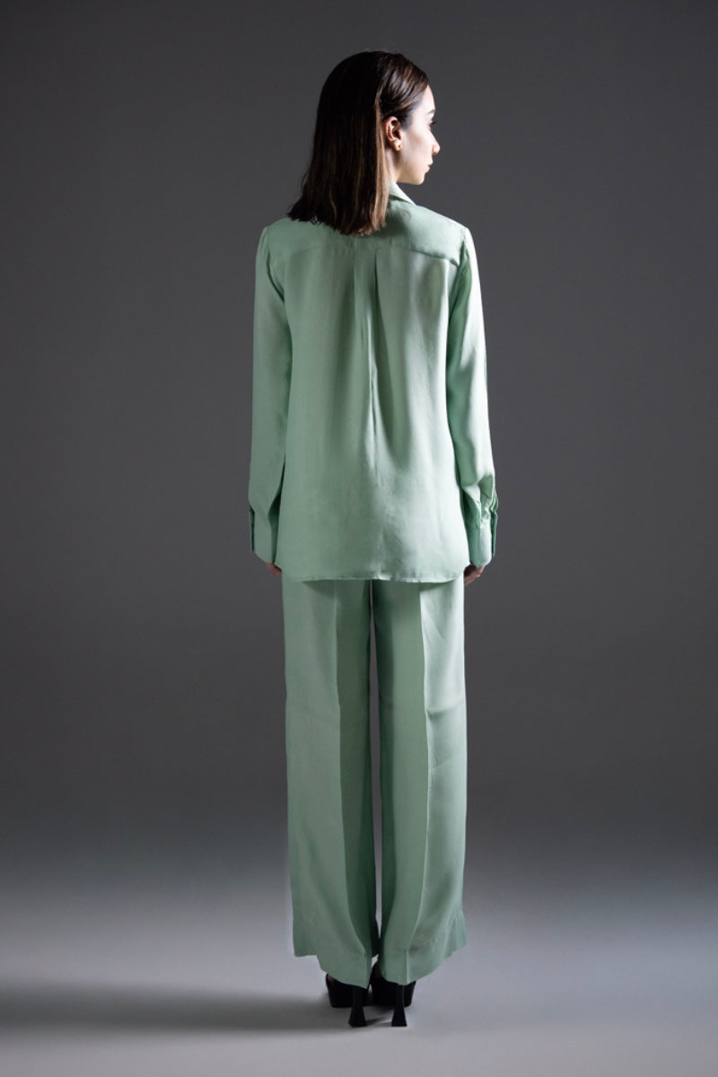 Aquamarine crepe fabric cord set, with French two piece collar, box cut button down shirt. Paired with straight boot-cut belt trouser. Detailed with monotone hooded buttons and dart.