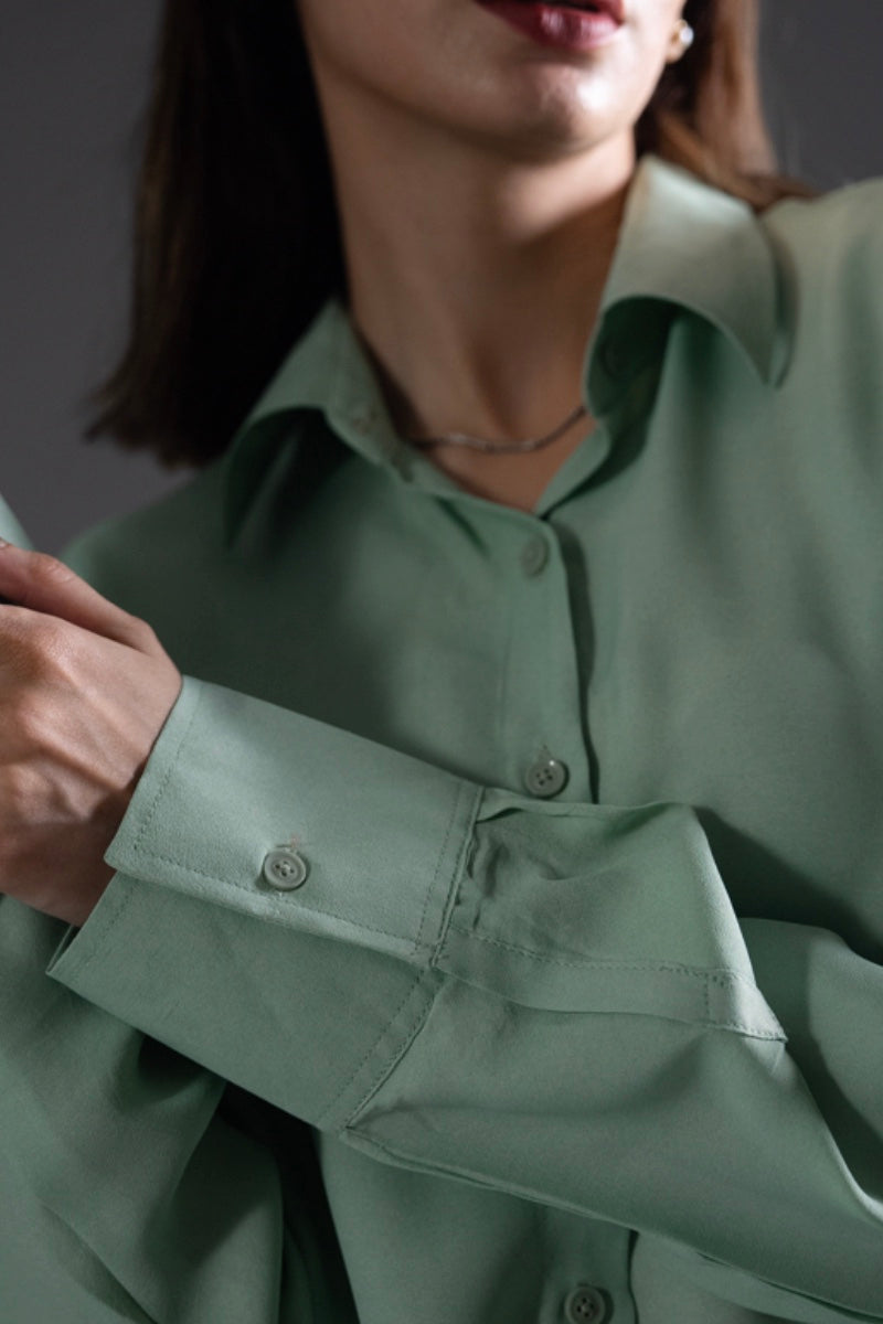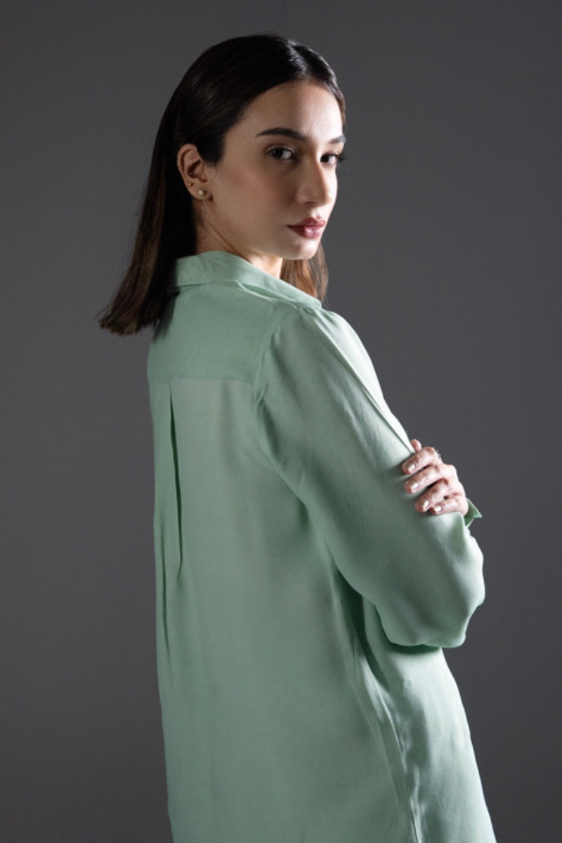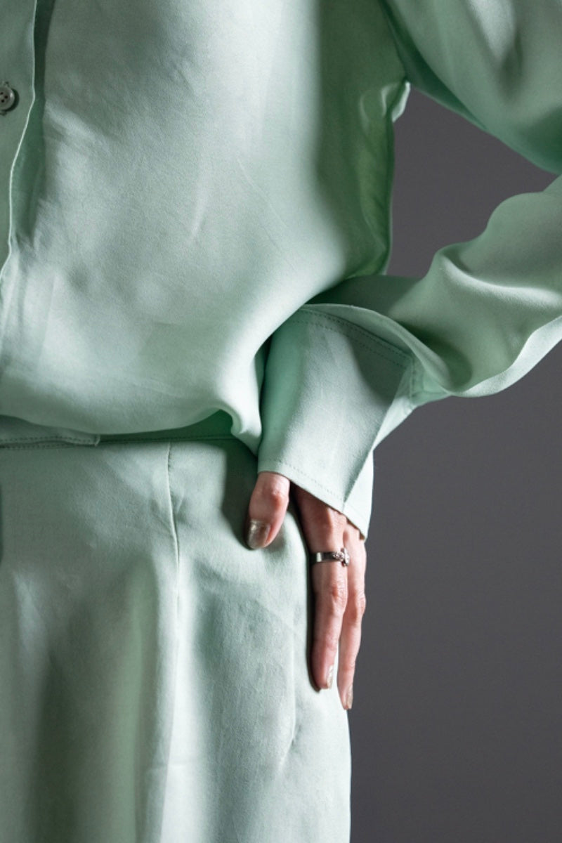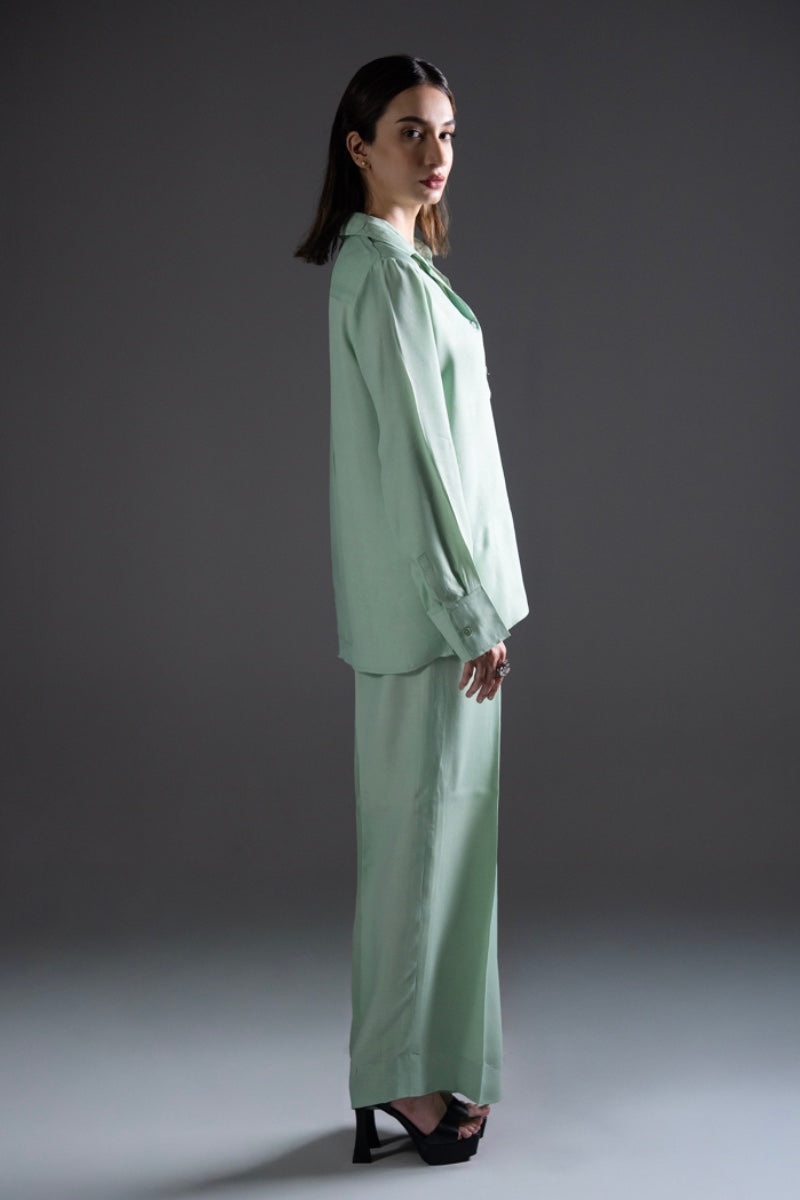 Aquamarine crepe fabric cord set, with French two piece collar, box cut button down shirt. Paired with straight boot-cut belt trouser. Detailed with monotone hooded buttons and dart.