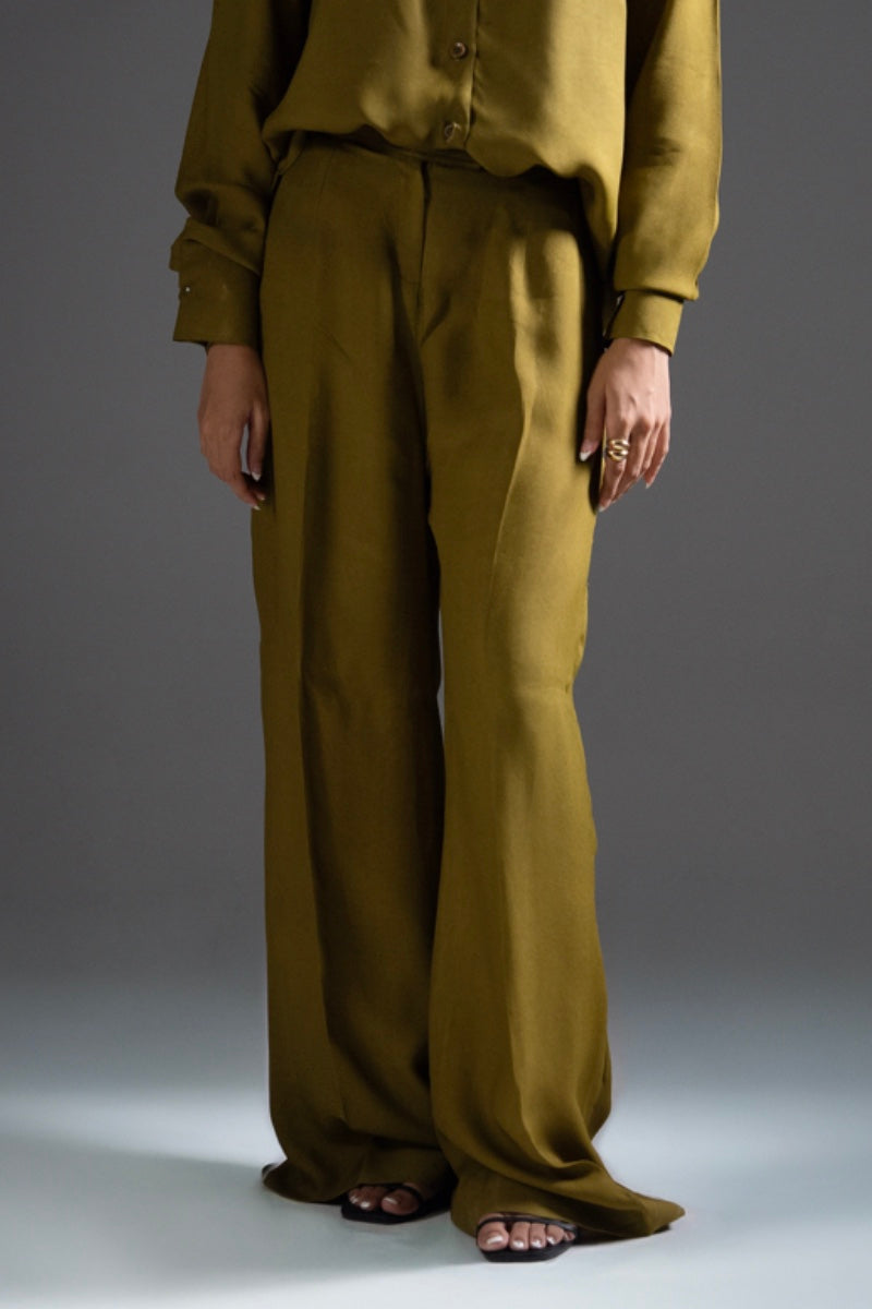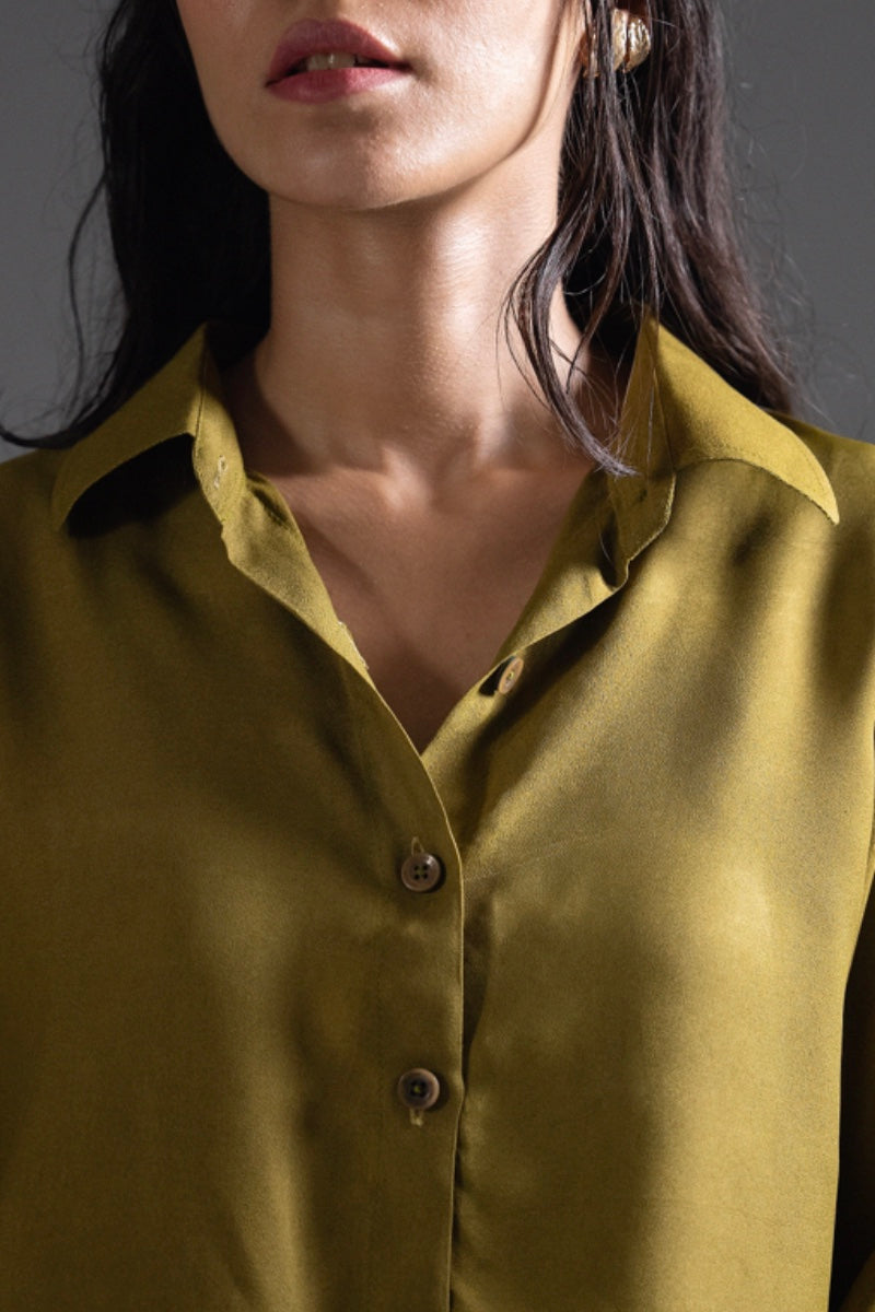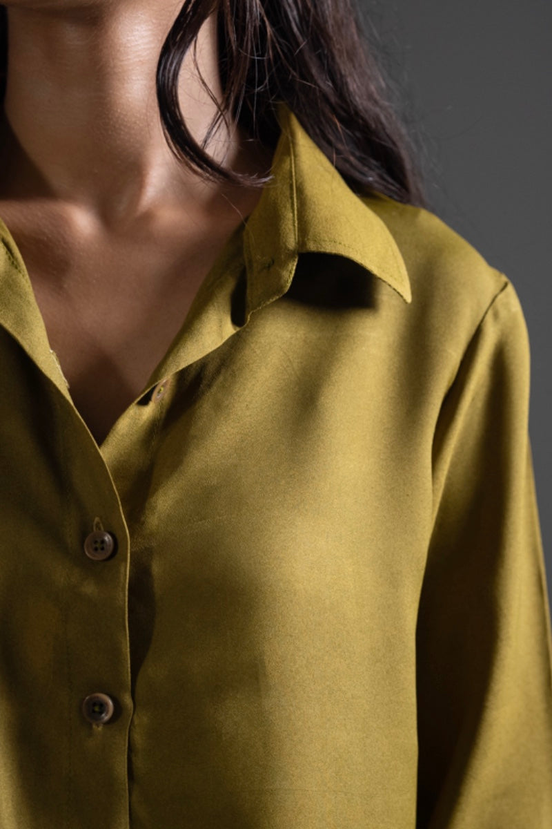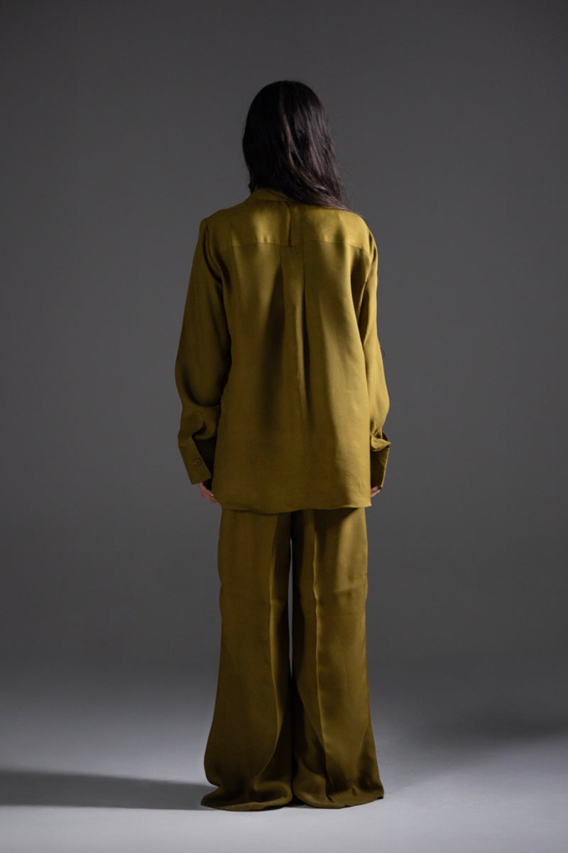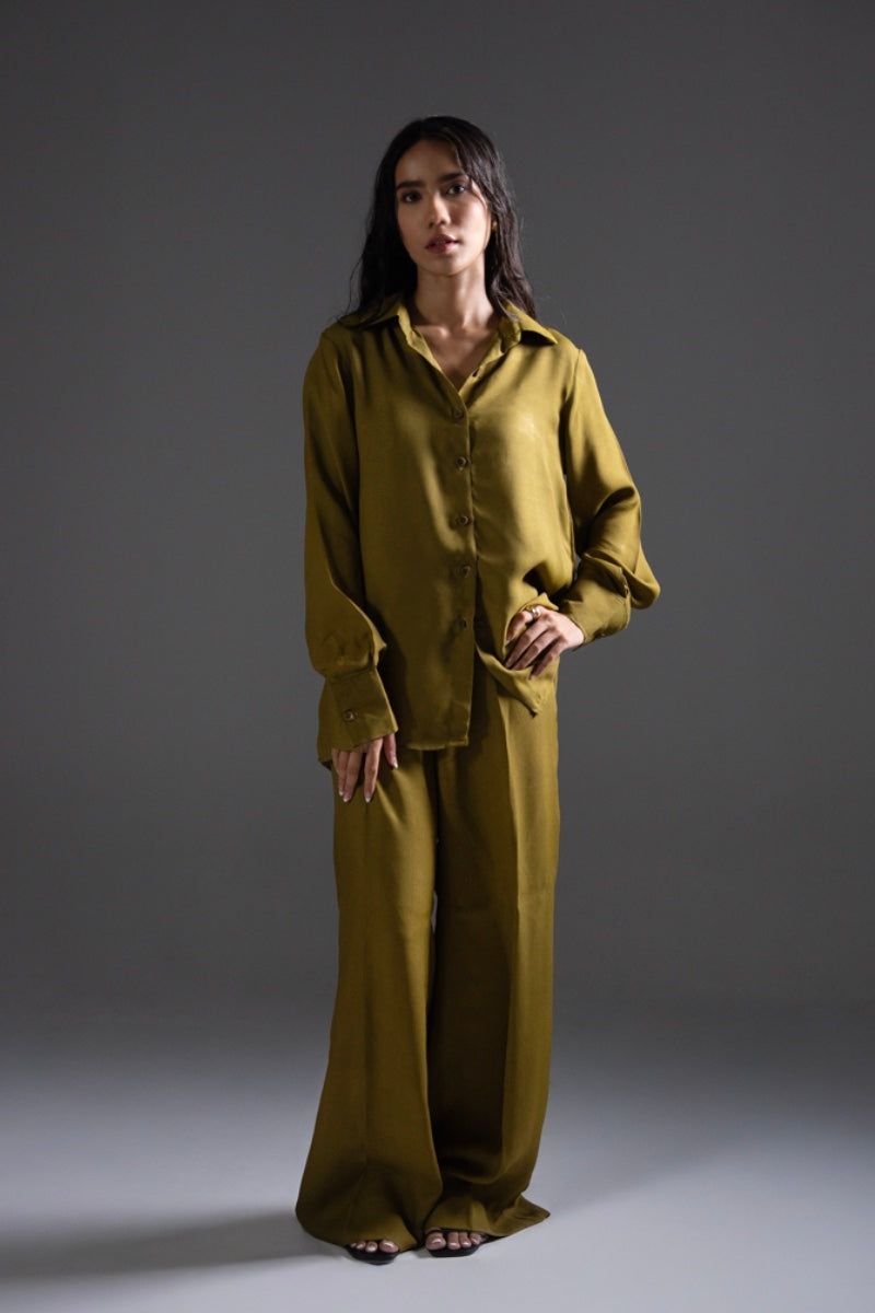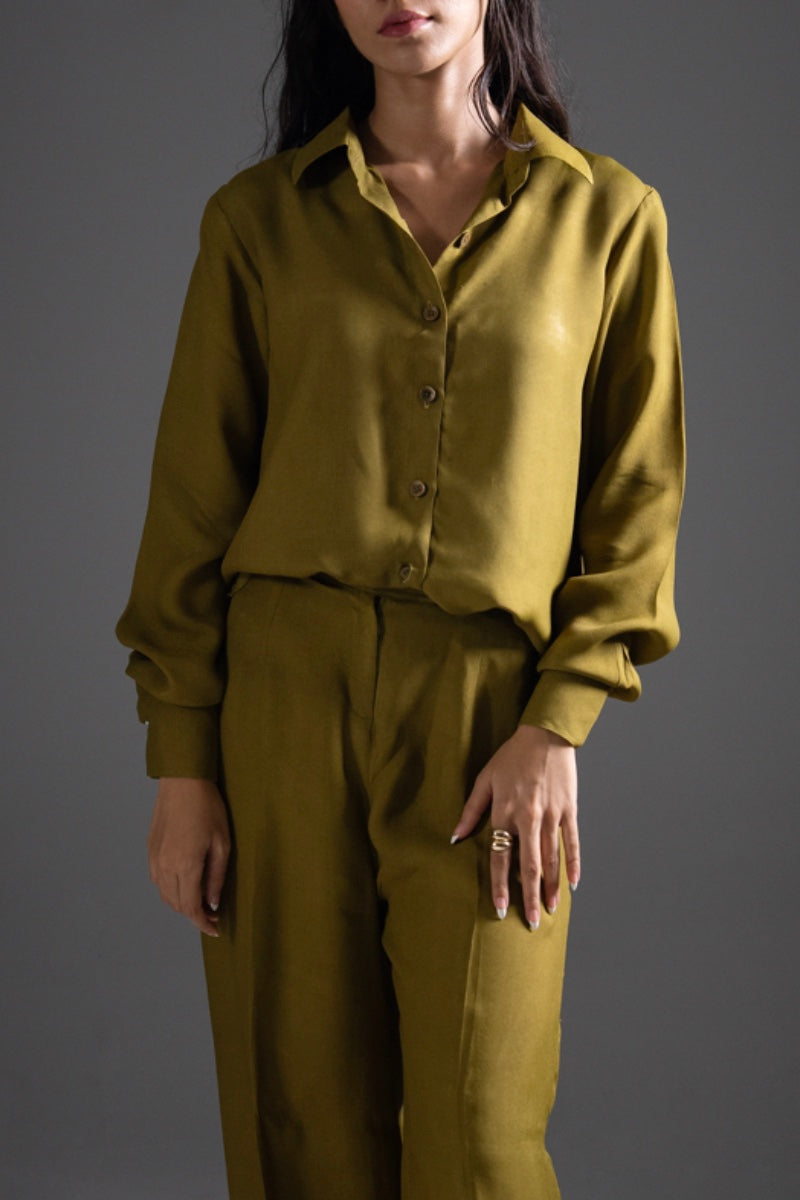 Dust Gold crepe fabric cord set, with French two piece collar, box cut button down shirt. Paired with straight boot-cut belt trouser. Detailed with wooden textured buttons and dart.