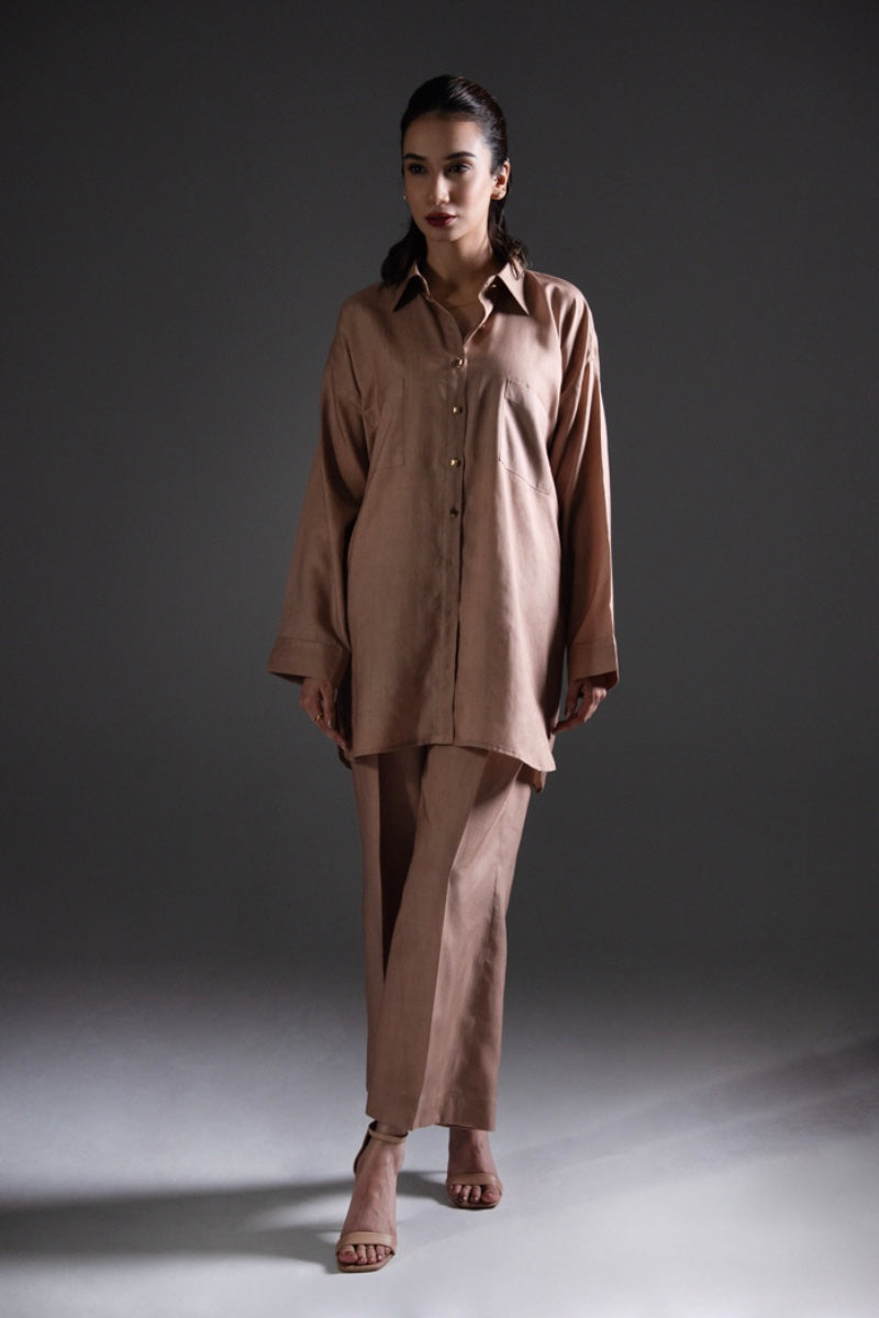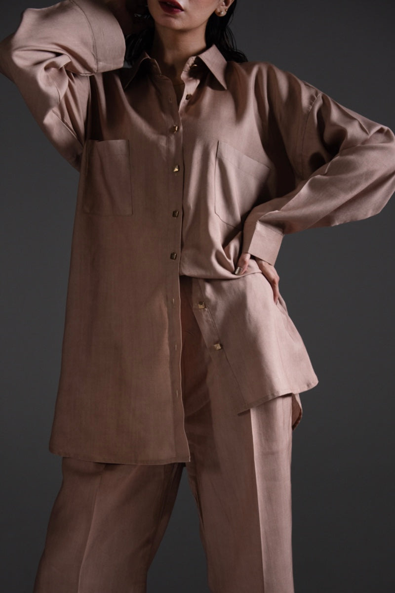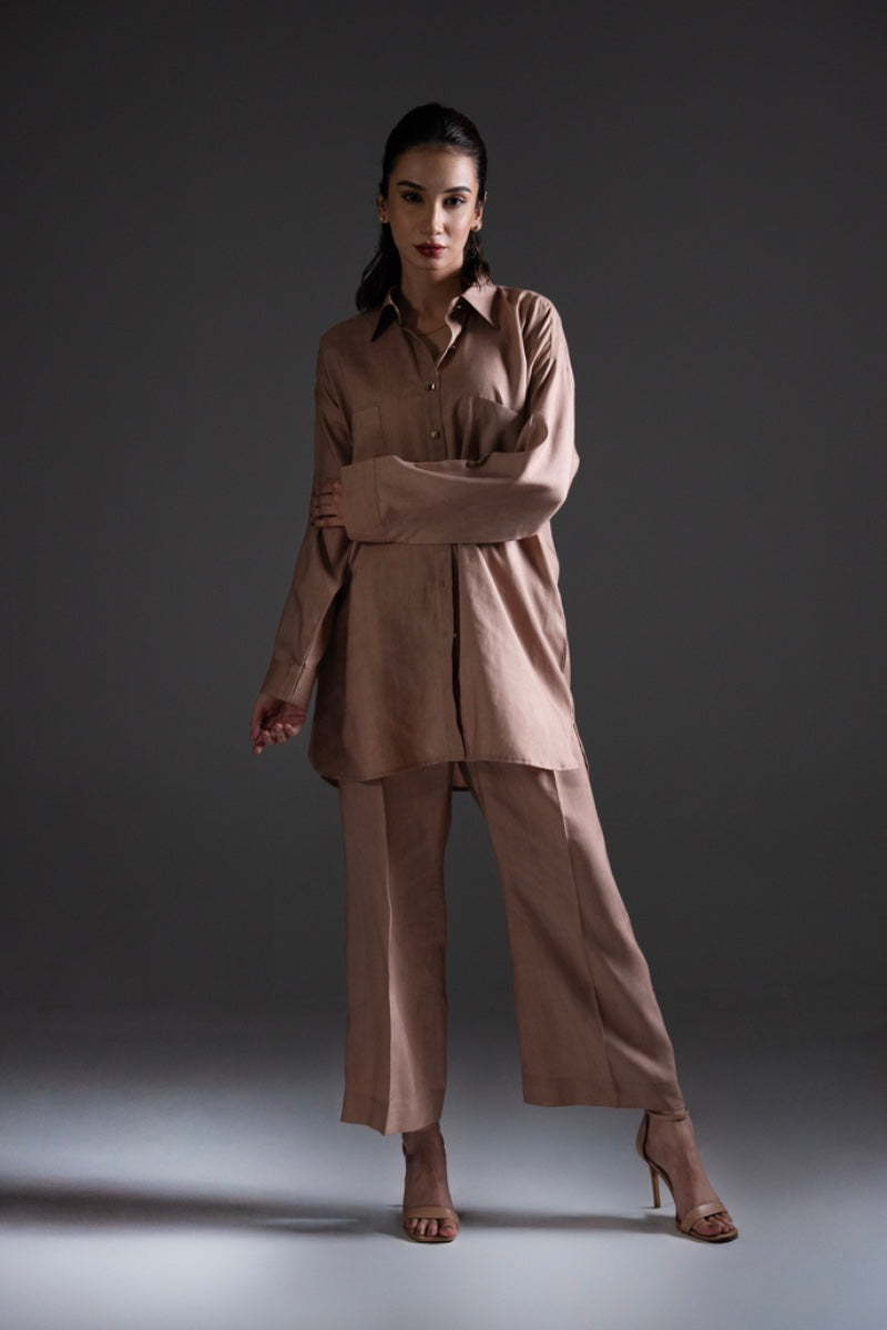 Champagne beige crepe fabric cord set, with French two piece collar, box cut button down shirt. Paired with straight boot-cut belt trouser. Detailed with metallic gold buttons, front patch pockets and dart.