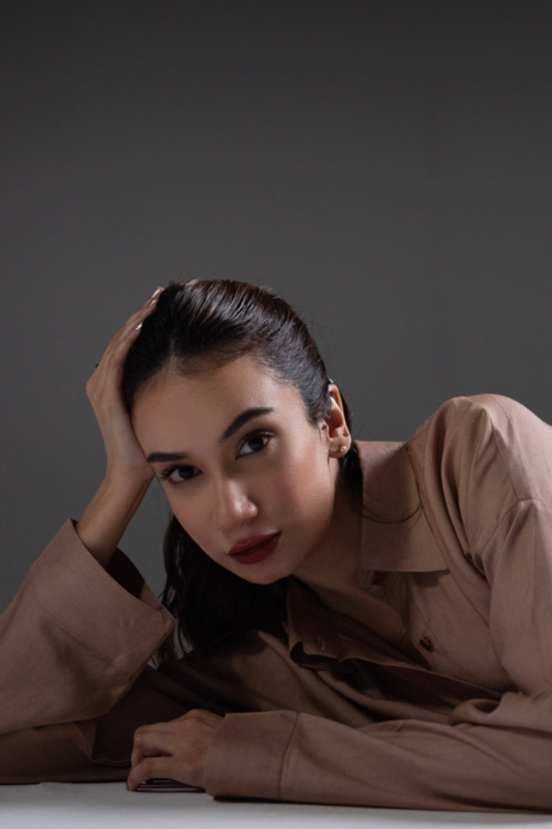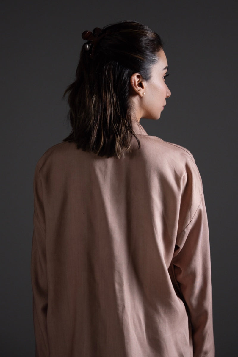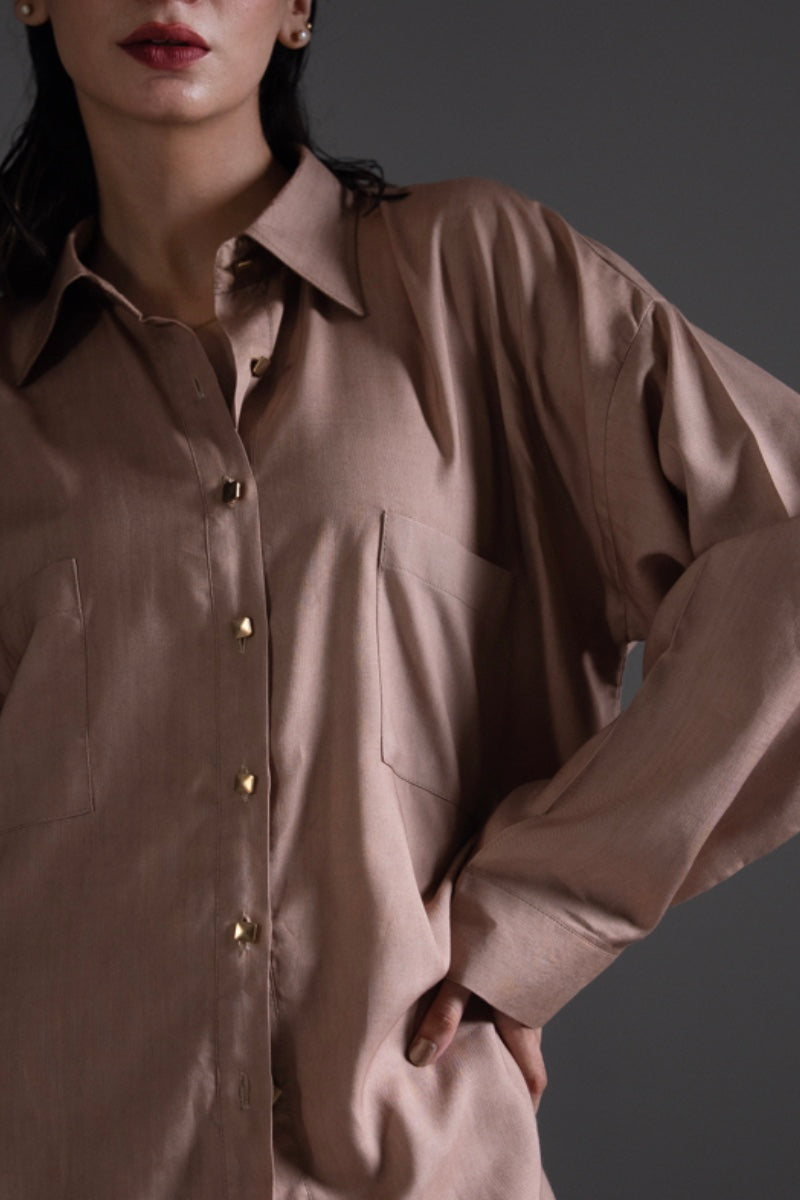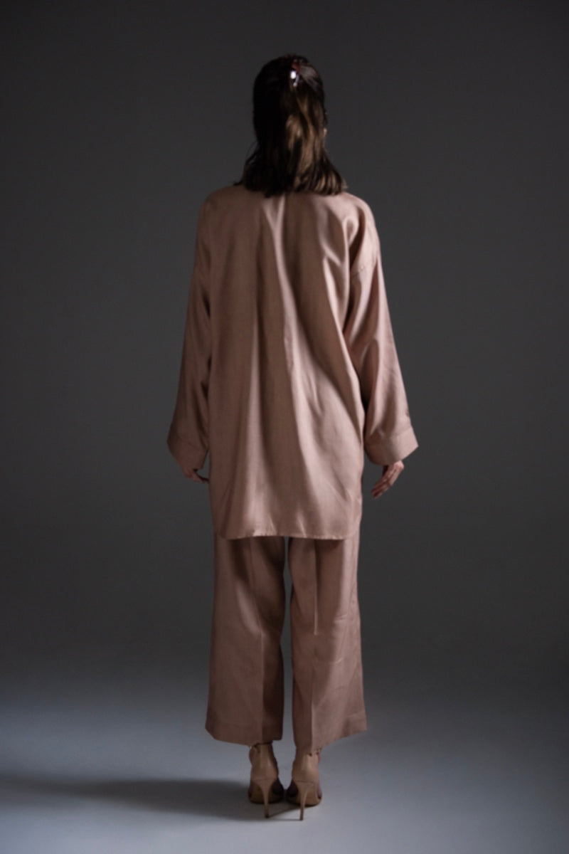 Champagne beige crepe fabric cord set, with French two piece collar, box cut button down shirt. Paired with straight boot-cut belt trouser. Detailed with metallic gold buttons, front patch pockets and dart.