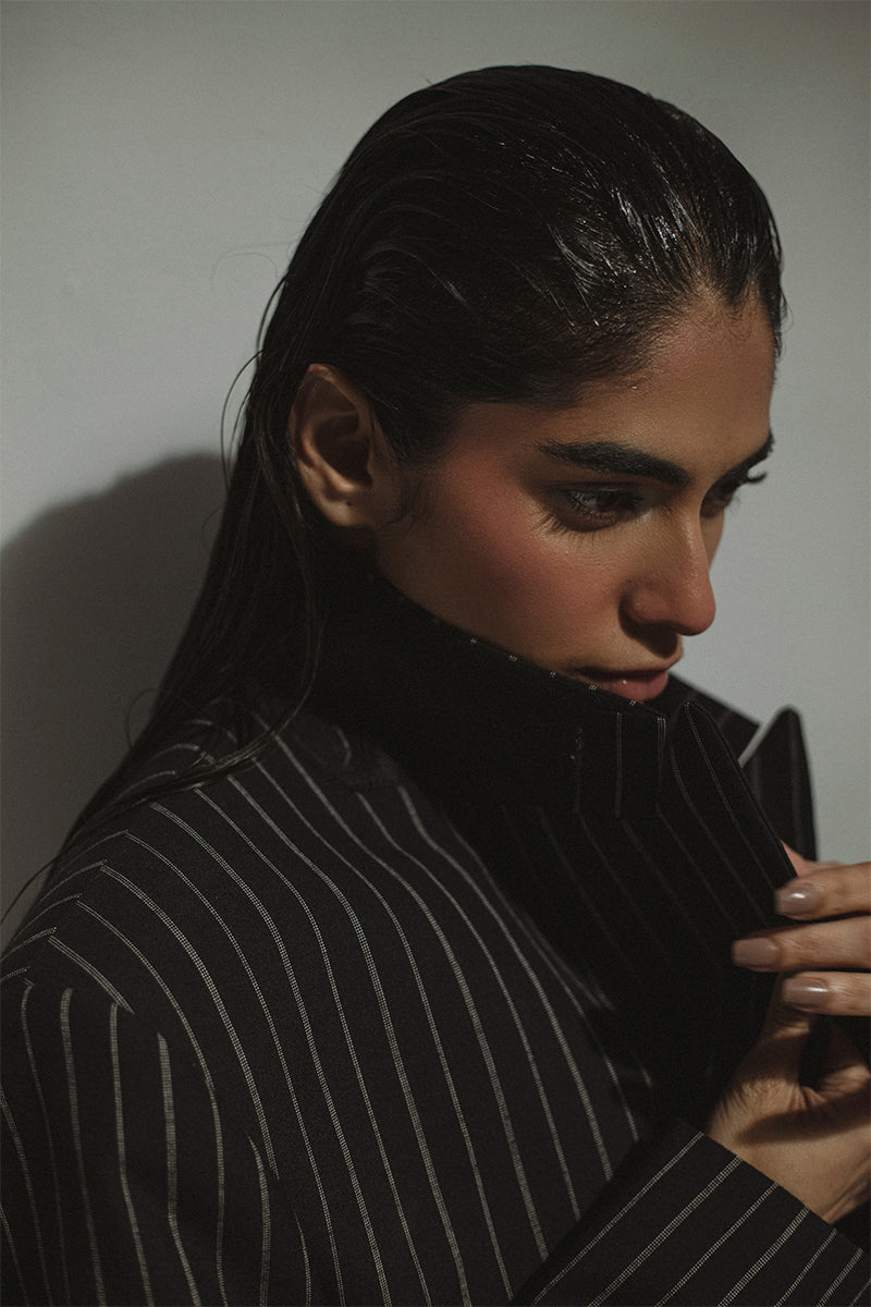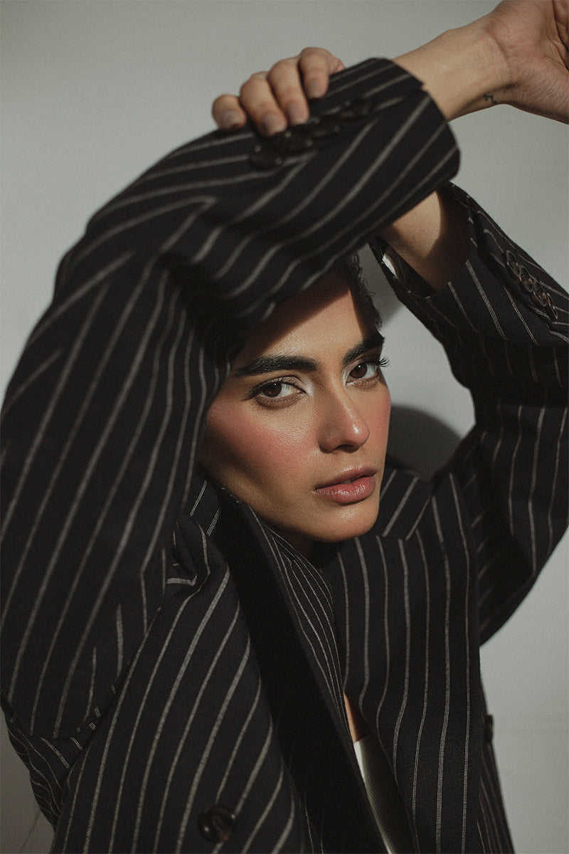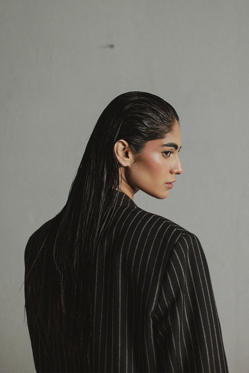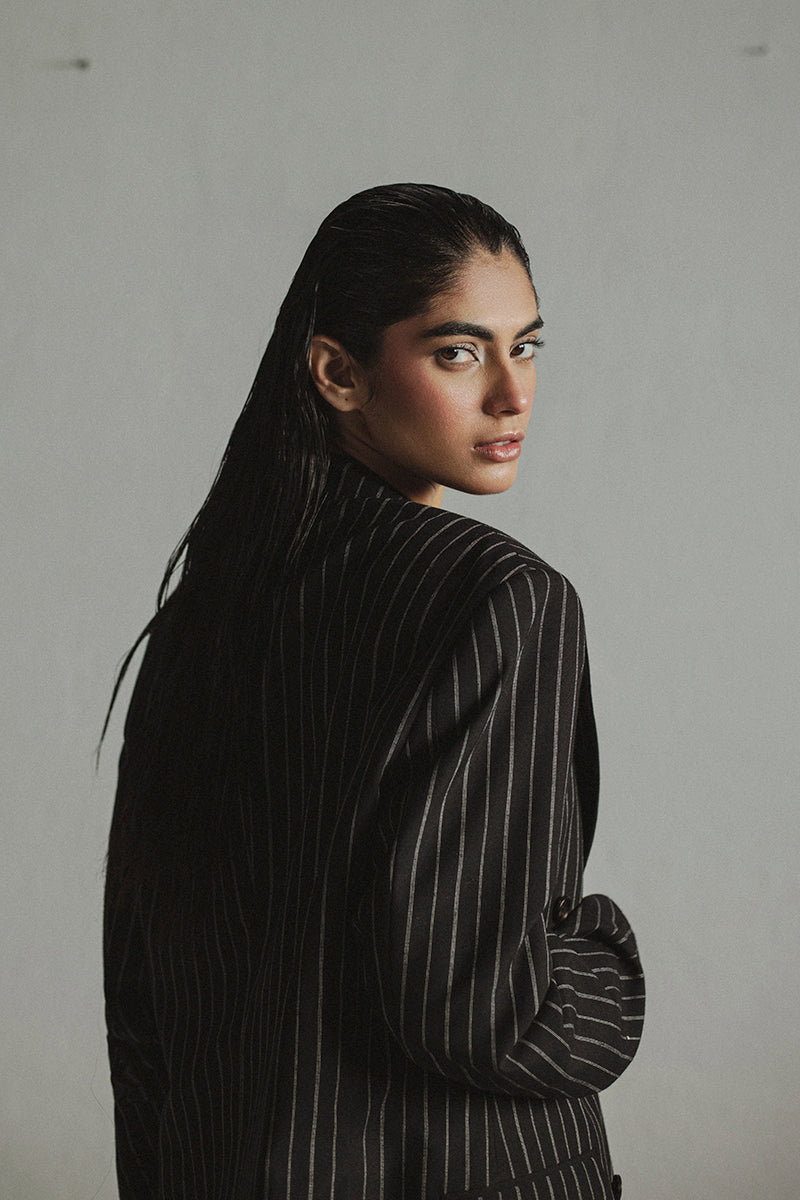 Oversize fit pin-striped blazer made in viscose blend fabric. Featuring a wide-spread peak lapel collar, long sleeve, flap pockets at the hip, inside pockets, double back vent and front button fastenings.